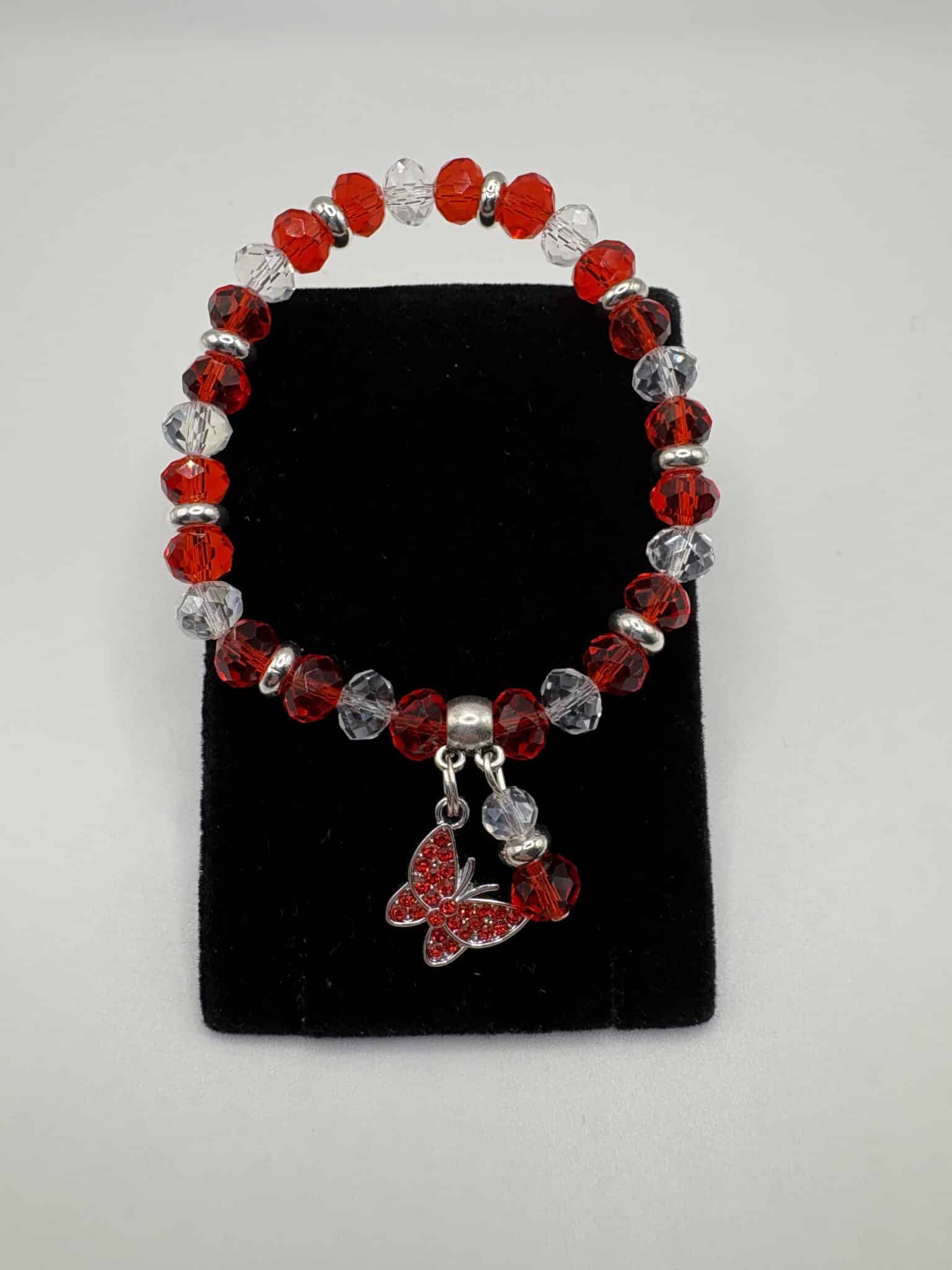 This stretch bracelet is made with 8mm red and clear crystal beads, silver plated donut beads, silver plated & red rhinestone butterfly.