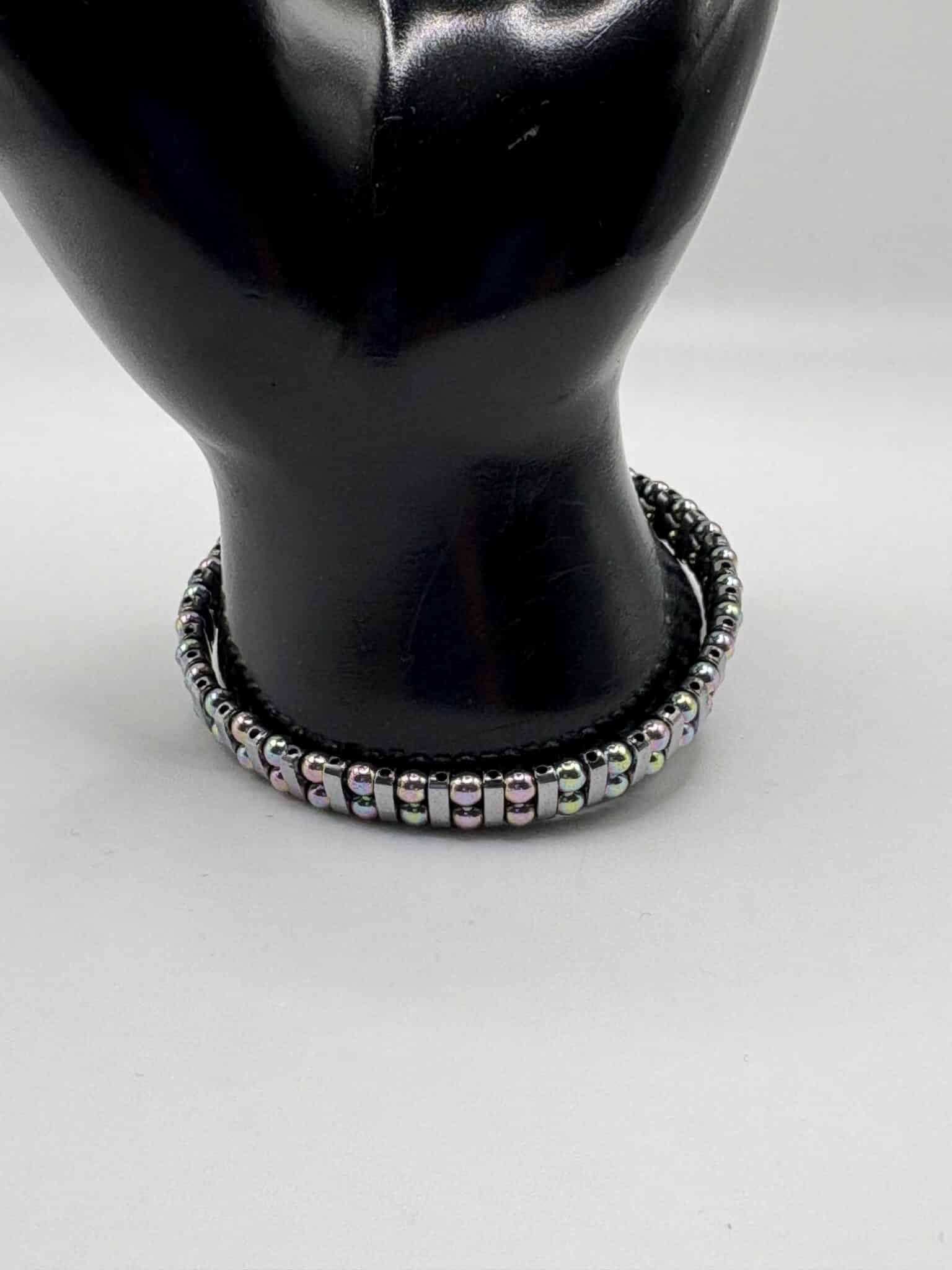 This stretch beaded bracelet is made with silver/pink/green 3mm Hematite (never seen these before), 6mm silver tone Hematite spacers and 4mm silver metal beads. (Again the bigger beads can be a feature or hidden).