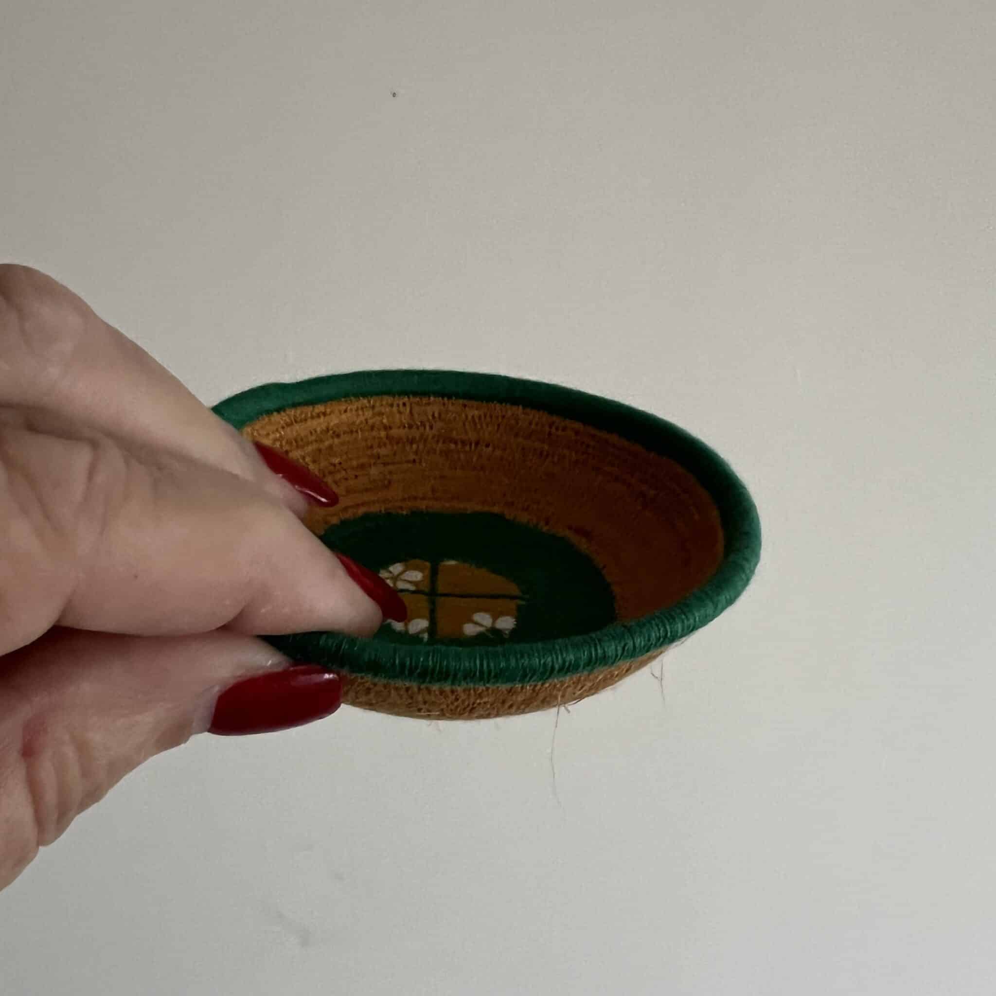 A decorative mustard and green trinket bowl. a vibrant useful piece to store small items like keys, loose change or jewellery. Showcase it on a coffee table, desk or bookshelf. Can make a piece that gits with your decor.