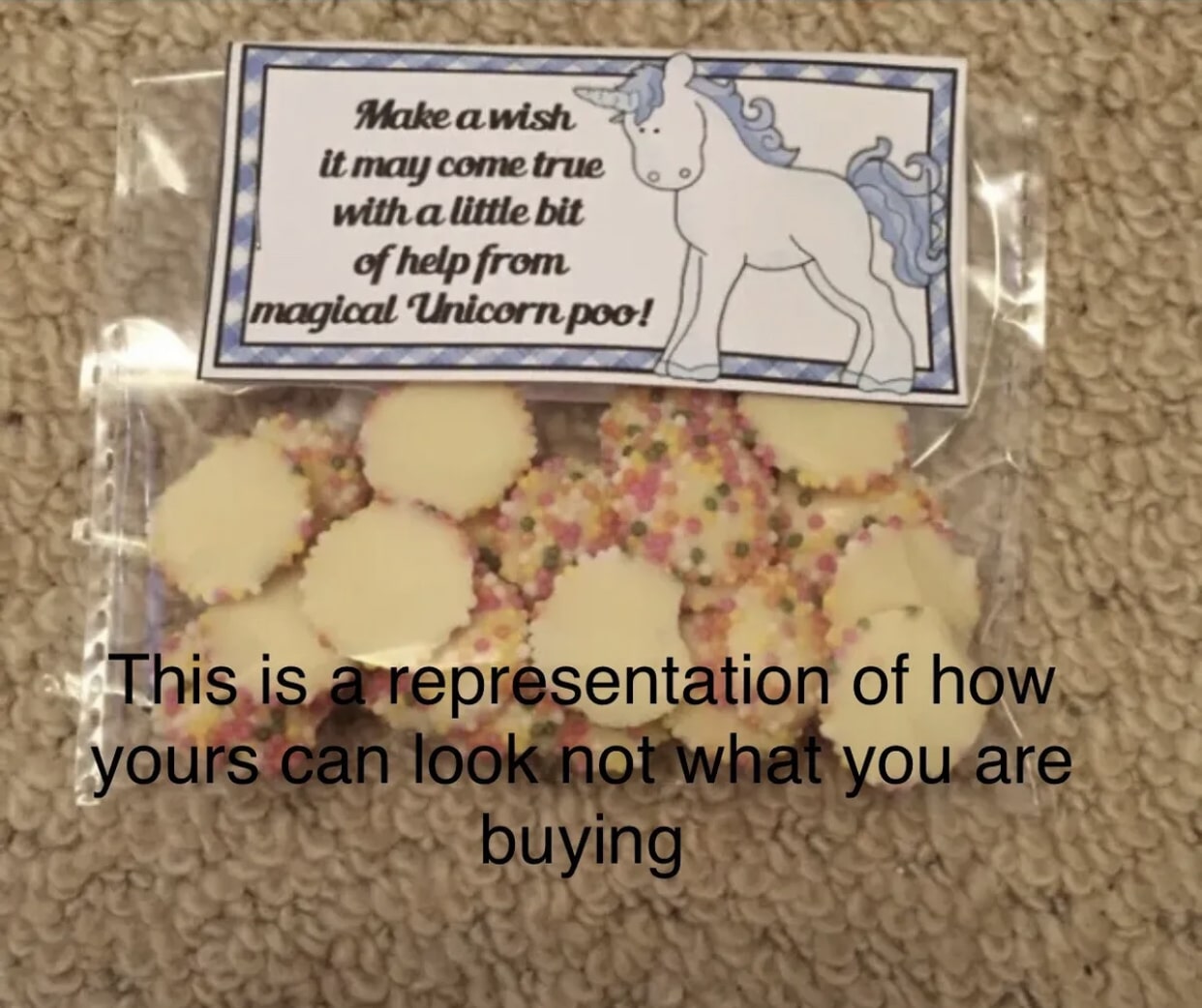 2 toppers to make your own unicorn poop I use an a5 craft packet which can be purchased on line or in the works fill with your choice of sweets I use white chocolate buttons covered in sprinkles makes a lovely novelty or gag gift