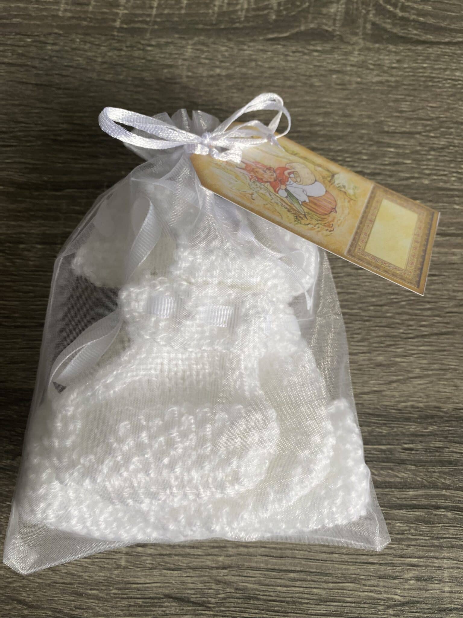 Comes in a white organza gift bag and tag.