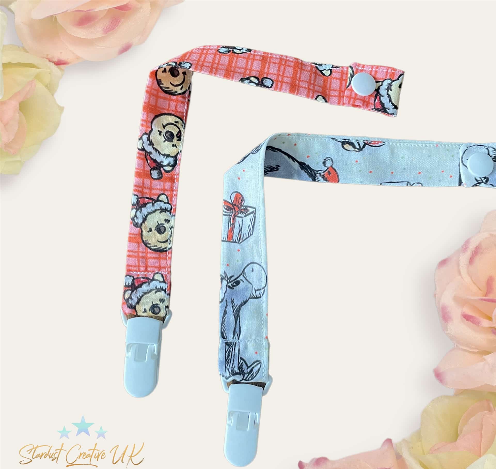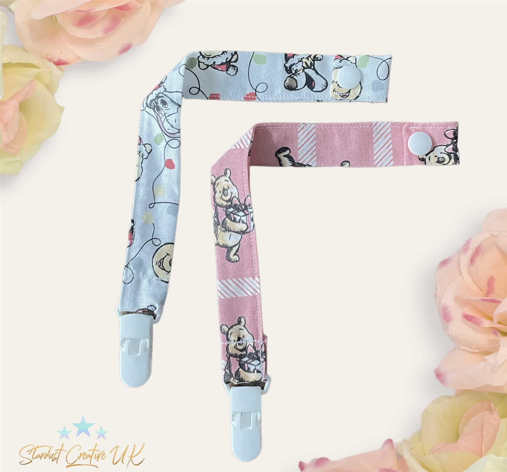 These are Festive Winnie the Pooh Dummy / pacifier / soother clips.
