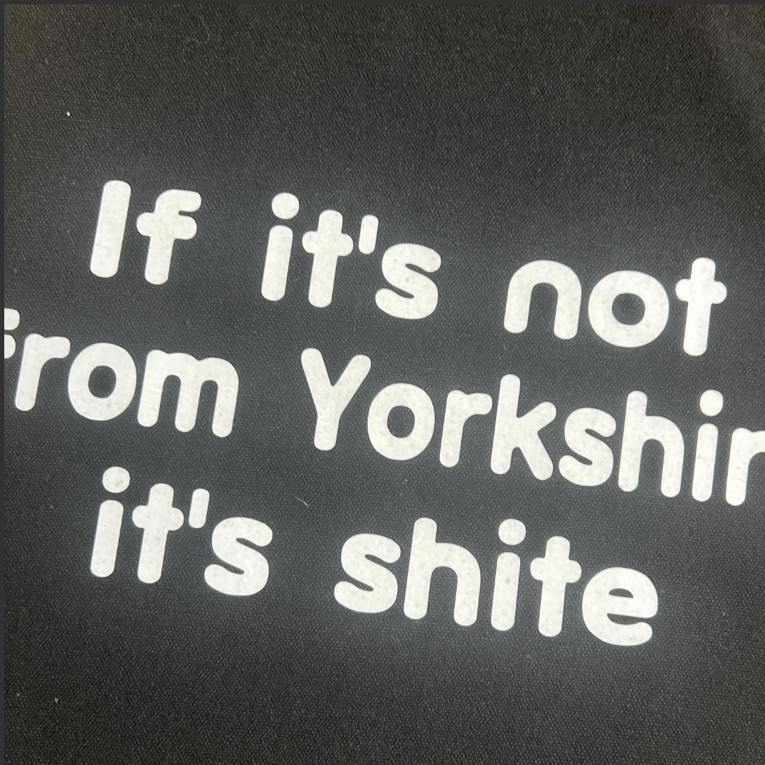 Say it loud and proud — Yorkshire knows best! This black tote bag features the unapologetically honest slogan “If it’s not from Yorkshire, it’s shite”.